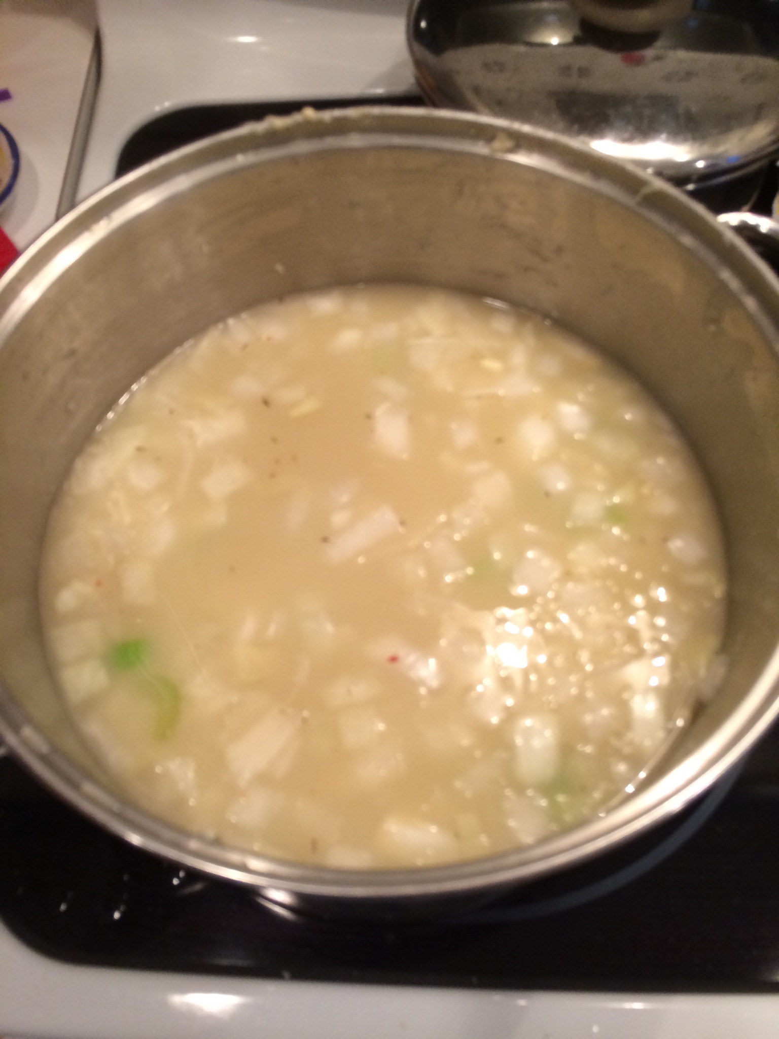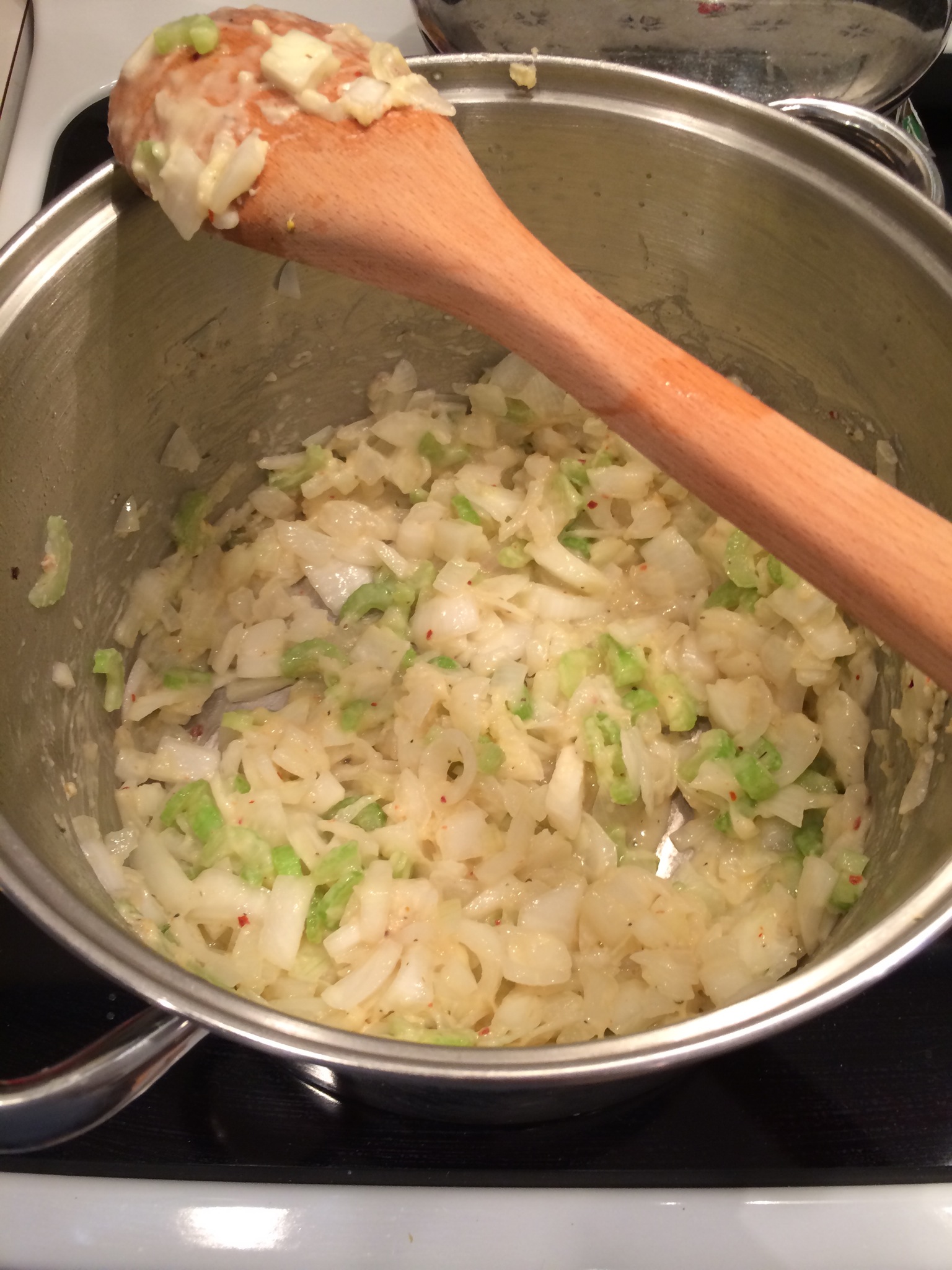 1. Melt 3 tablespoons of butter over medium heat in large stock pot and add onion and celery and seasonings. Soften but don’t brown, about 7 minutes.