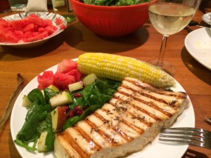 We served with roasted corn on the cob, watermelon and pear and pomegranate salad.