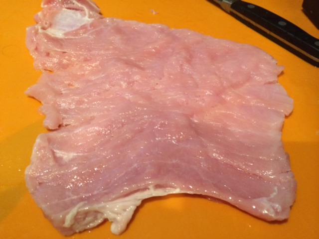 The first step is to take a boneless pork chop, and cut off the fat and get ready to pound.